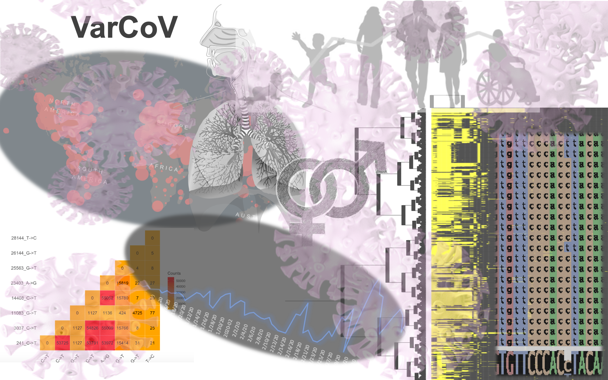 VarCoV is providing a platform for exploring SARS-CoV-2 variations in the context of available clinical/demographic data. It provides recurrence and interrelations of single nucleotide substitutions based on various criteria. It also includes the frequency of mutations based on SARS-CoV genomes retrieved from NCBI. SARS-CoV-2 genomes/metadata have been retrieved from GISAID.